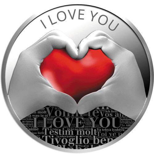 На аверсі монети зображені дві руки, що утворюють серце навколо яскраво-червоного центру — символу щирого кохання. У верхній частині розташовано напис «I LOVE YOU», а тло нижньої половини прикрашене словами «Я тебе кохаю» різними мовами світу: англійською, французькою, італійською, німецькою, російською та іншими. Кольорове покриття надає монеті емоційності й сучасного вигляду.