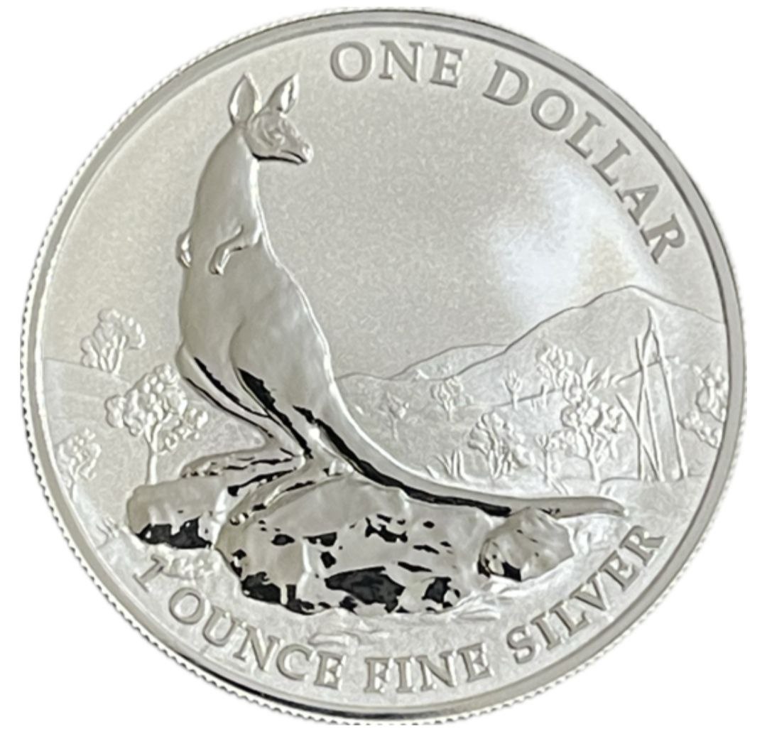 Реверс монети прикрашає реалістичне зображення кенгуру, що стоїть на скелястому підвищенні серед австралійських пейзажів. Над твариною розміщено напис «ONE DOLLAR», а внизу — «1 OUNCE FINE SILVER». Дизайн підкреслює природну гармонію дикої фауни та величність національного символу країни.