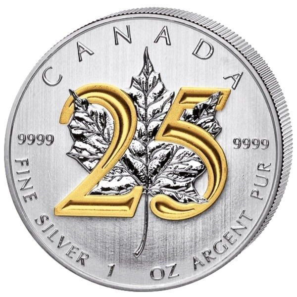 Реверс монети прикрашено центральним зображенням кленового листка – національного символу Канади. Поверх нього нанесено позолочене число «25», що символізує 25-річний ювілей серії. По обидва боки листка розміщено маркування чистоти срібла «9999», а по колу викарбувані написи «CANADA» і «FINE SILVER 1 OZ ARGENT PUR».