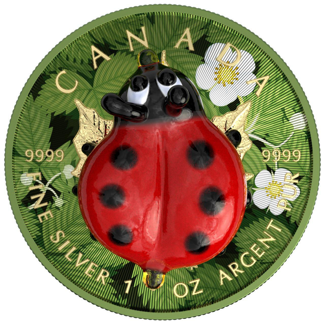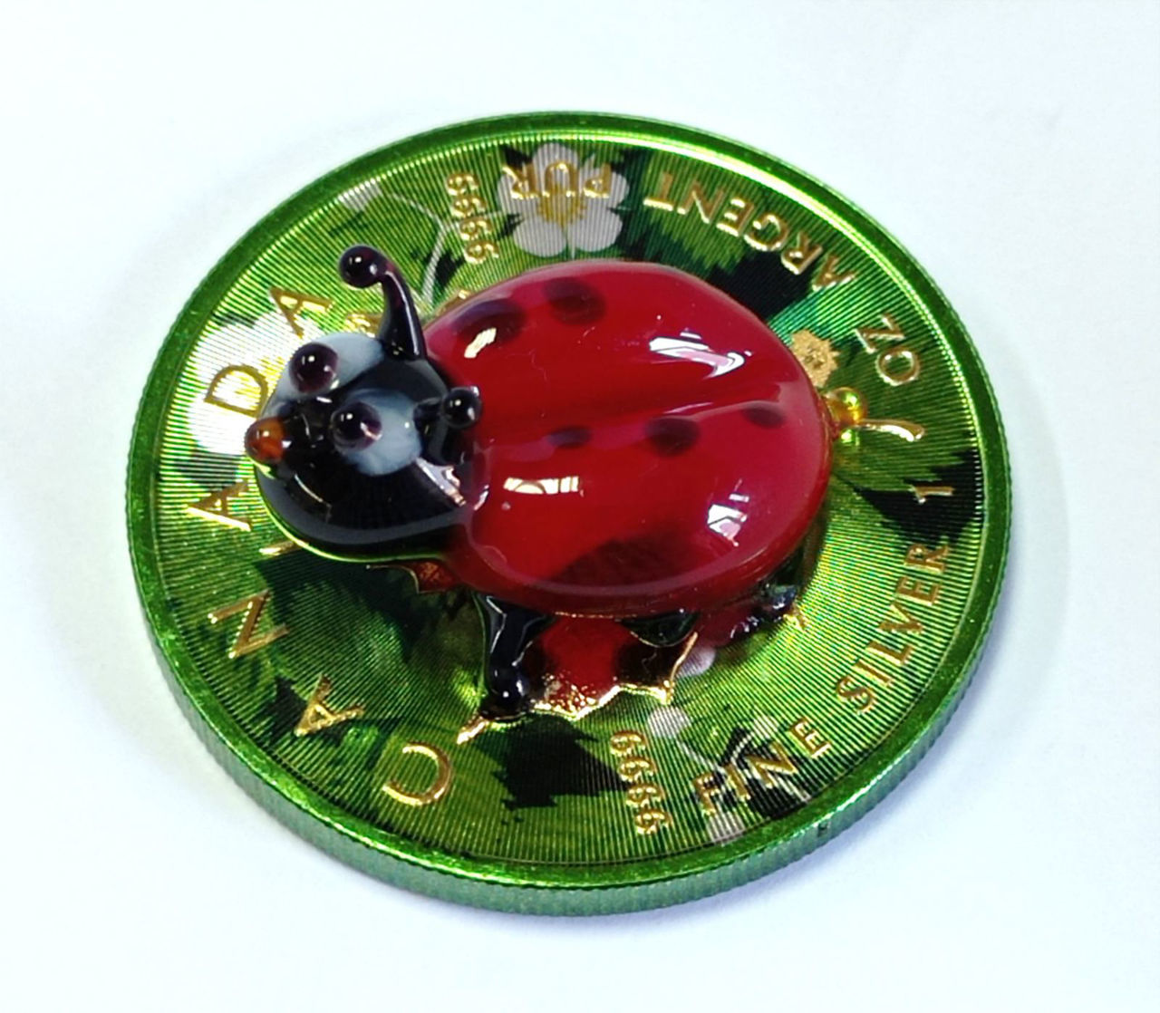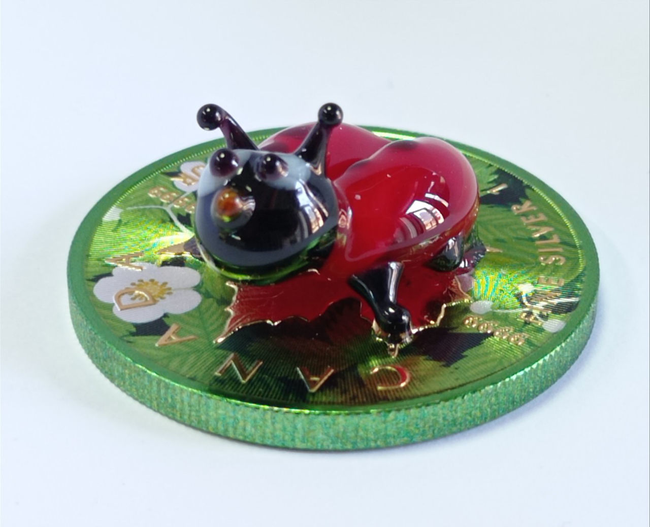 Реверс монети прикрашений знаменитим символом Канади — кленовим листком, який виконано з високим рельєфом і покрито золотим відтінком. Поверх нього розташована реалістична скляна Божа корівка, створена вручну з червоно-чорними деталями. Тло оформлено в яскраво-зеленому кольорі, на якому видно білий цвіт, що символізує пробудження природи. Написи «CANADA», «FINE SILVER 1 OZ ARGENT PUR» і «9999» підтверджують походження та чистоту срібла.