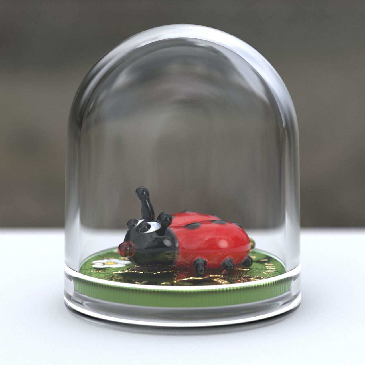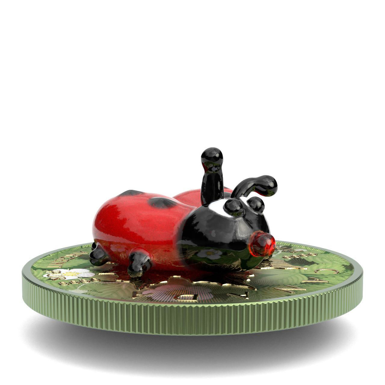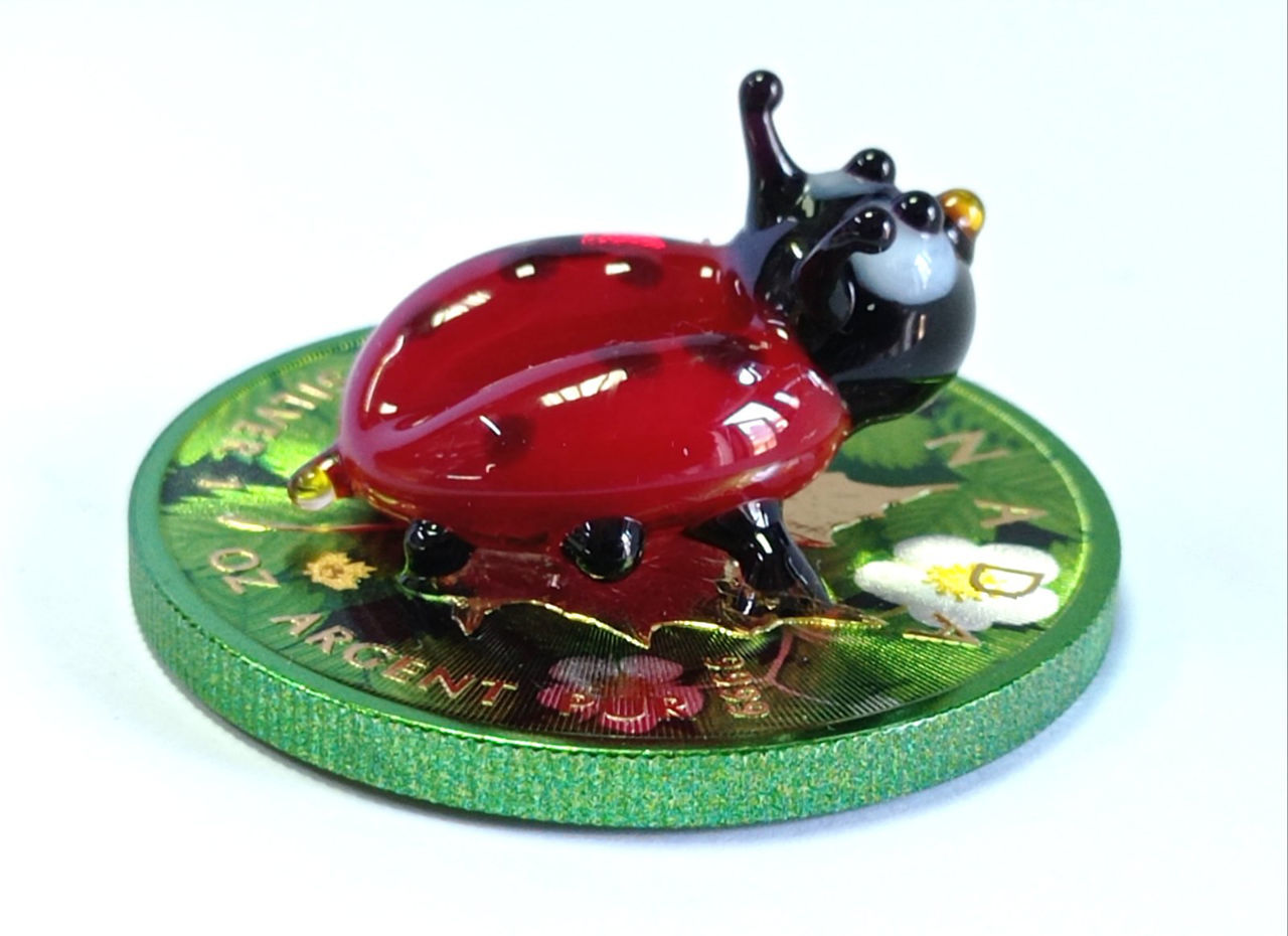 Реверс монети прикрашений знаменитим символом Канади — кленовим листком, який виконано з високим рельєфом і покрито золотим відтінком. Поверх нього розташована реалістична скляна Божа корівка, створена вручну з червоно-чорними деталями. Тло оформлено в яскраво-зеленому кольорі, на якому видно білий цвіт, що символізує пробудження природи. Написи «CANADA», «FINE SILVER 1 OZ ARGENT PUR» і «9999» підтверджують походження та чистоту срібла.