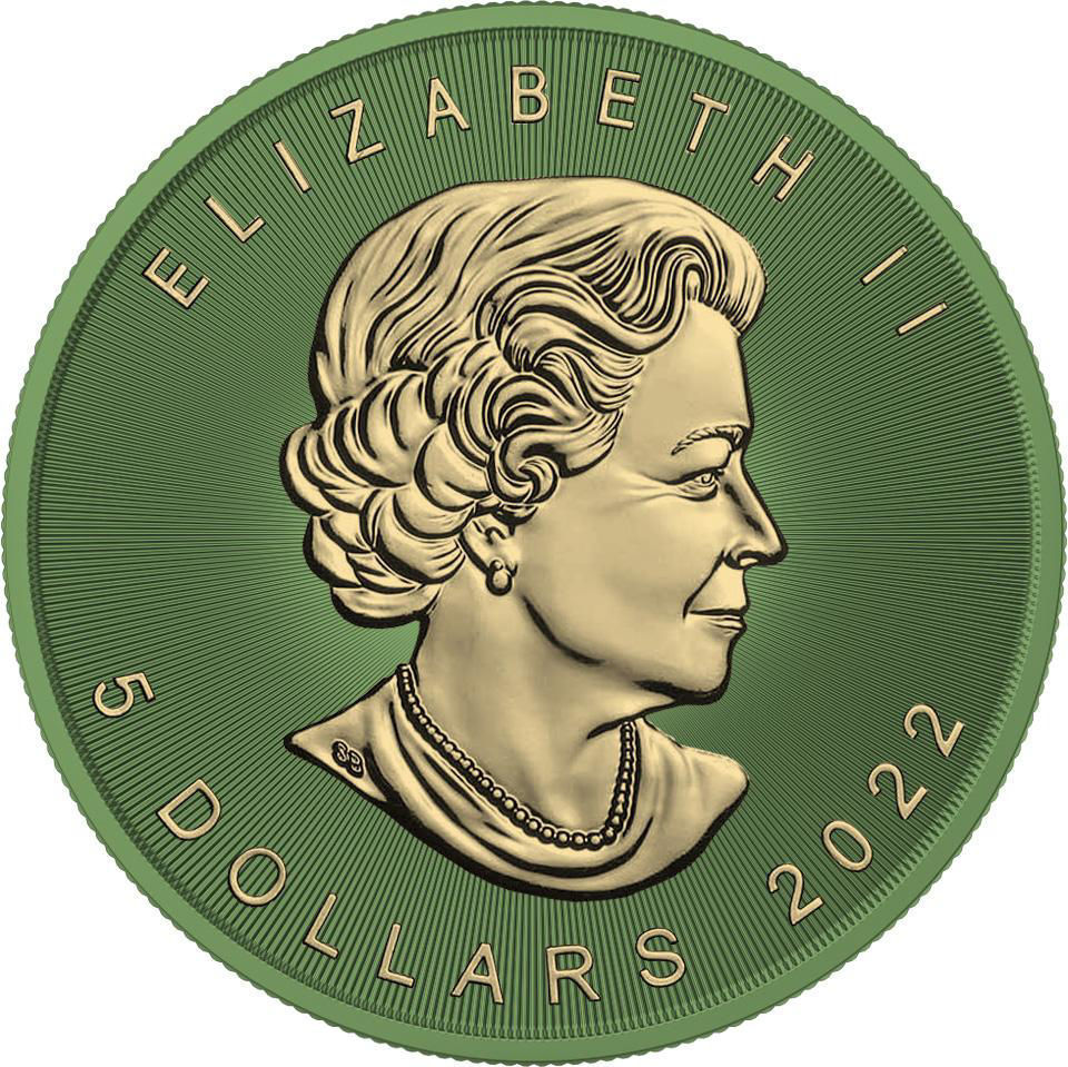 На аверсі монети зображено портрет Її Величності королеви Єлизавети II, створений художником Сюзанною Блант. Портрет виконаний на зеленому тлі з радіальним мікротекстурним узором, що додає монеті глибини та блиску. Навколо зображення викарбувані написи «ELIZABETH II», «5 DOLLARS» та «2022».