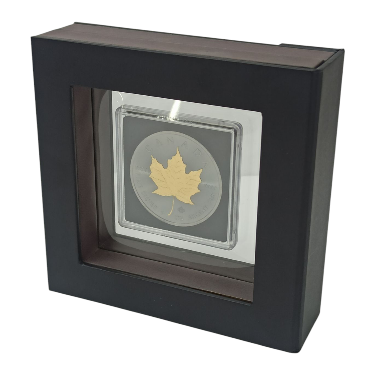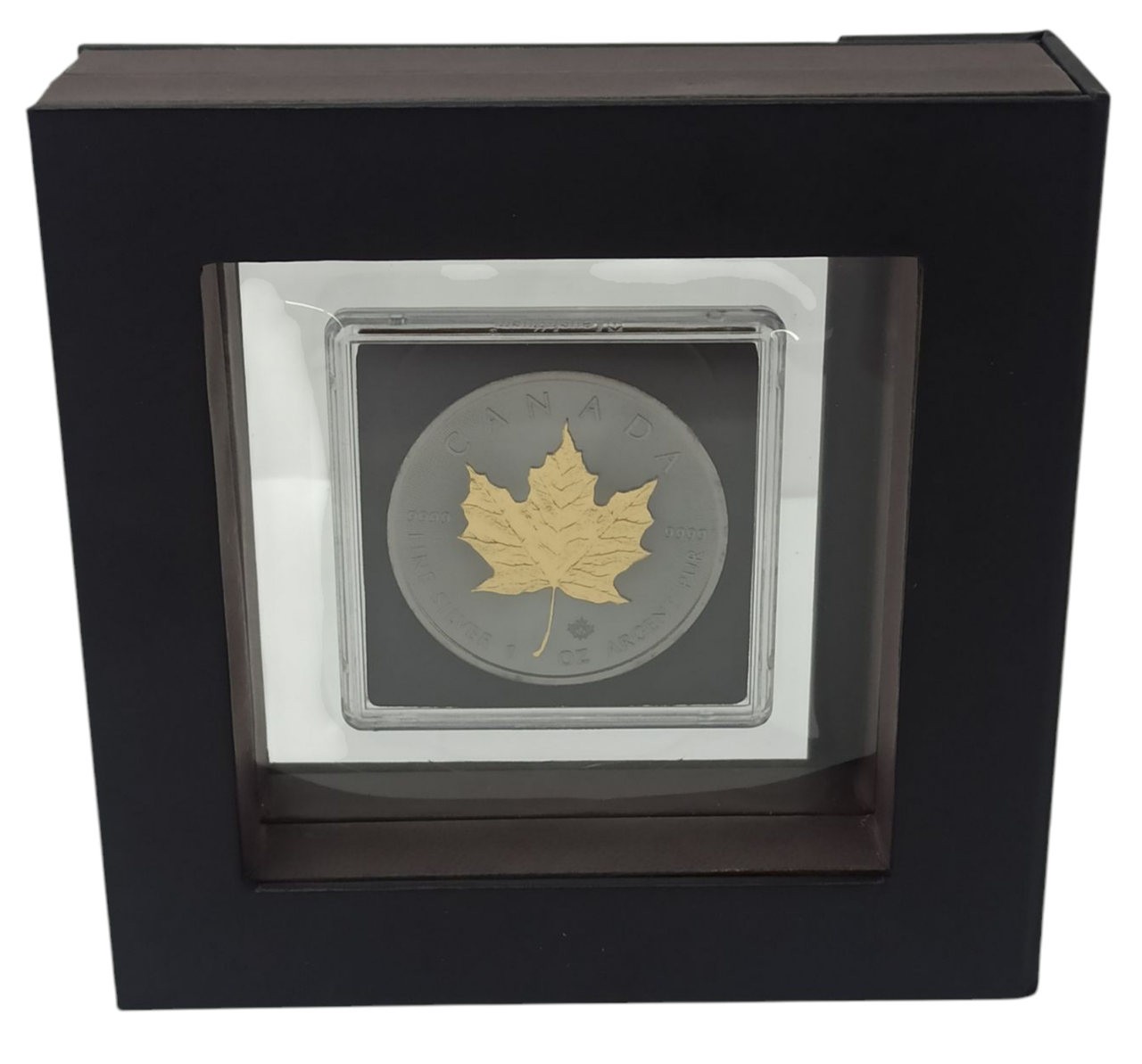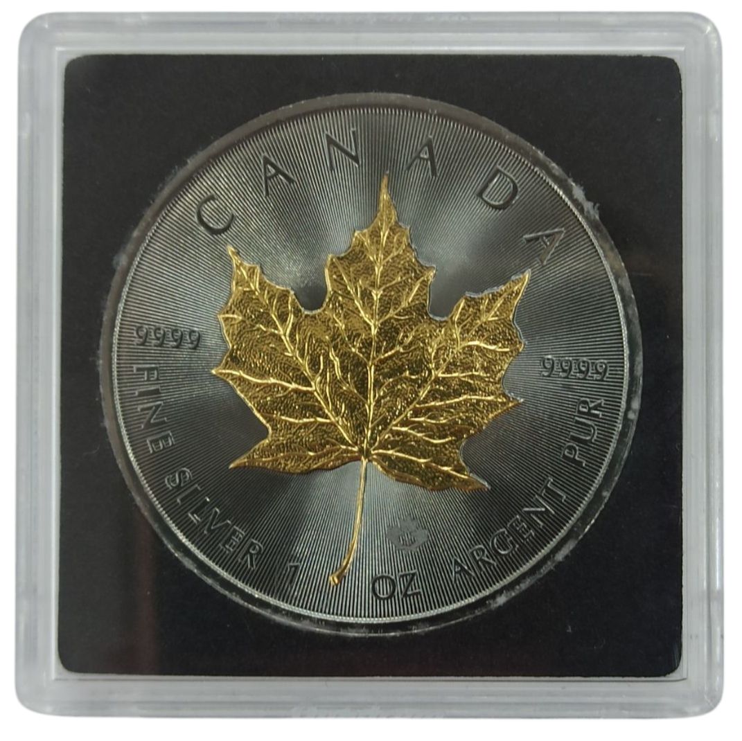 Реверс прикрашено детальним зображенням кленового листа, вкритого позолотою 24K, що контрастує із темним фоном і створює виразний візуальний ефект. Надпис «CANADA», проба срібла «9999» та позначення ваги в одній тройській унції підкреслюють інвестиційний статус монети.