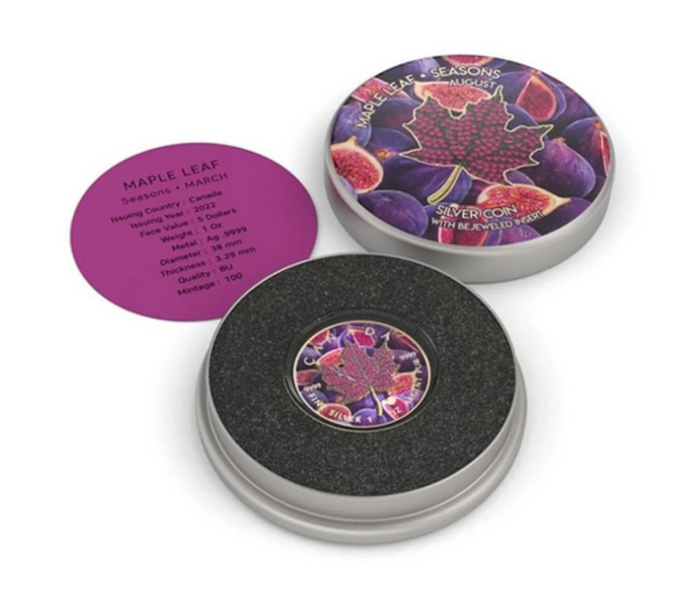 Реверс монети вражає яскравими фарбами та унікальною композицією. У центрі розташований рельєфний кленовий лист, інкрустований блискучими рожевими кристалами, що символізують серпневу енергію та пристрасну красу літа. Тло виконане у насичених фіолетово-багряних тонах із зображенням стиглих плодів, що передають атмосферу пізнього літа. Навколо розміщені написи «CANADA», «9999 FINE SILVER 1 OZ ARGENT PUR». Чорне покриття та золоті елементи створюють ефект дорогоцінного контрасту, який надає монеті виняткової глибини та елегантності.
