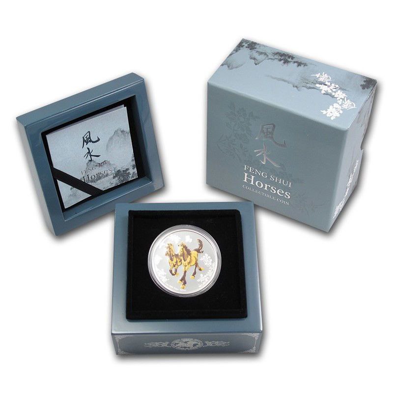 Срібна монета «Коні – Фен-Шуй» 2014 року випущена державою Ніуе на честь року Коня за китайським місячним календарем. Ця монета поєднує класичний дзеркальний блиск із кольоровим зображенням, передаючи енергію, гармонію та благородство цього сильного й вільного символу.