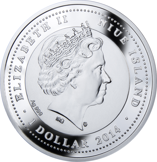 Аверс монети прикрашає традиційне зображення Її Величності Королеви Єлизавети II у профіль. Навколо викарбувані написи: «ELIZABETH II», «NIUE ISLAND», «1 DOLLAR» і рік випуску «2014». У нижній частині зазначено пробу металу — «Ag 999».