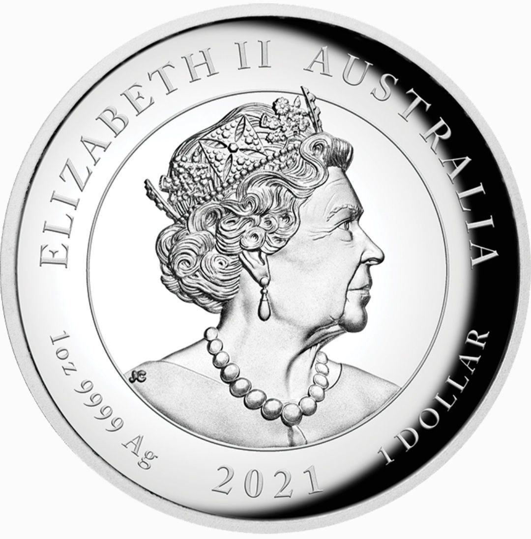 На аверсі зображено портрет Її Величності Королеви Єлизавети II у виконанні художника Джоді Кларка. Навколо портрета розміщено написи «ELIZABETH II AUSTRALIA», «1 DOLLAR», «2021» і позначення металу та проби — «1oz 9999 Ag». Дзеркальне тло підкреслює чіткість рельєфу та додає монеті офіційного блиску.