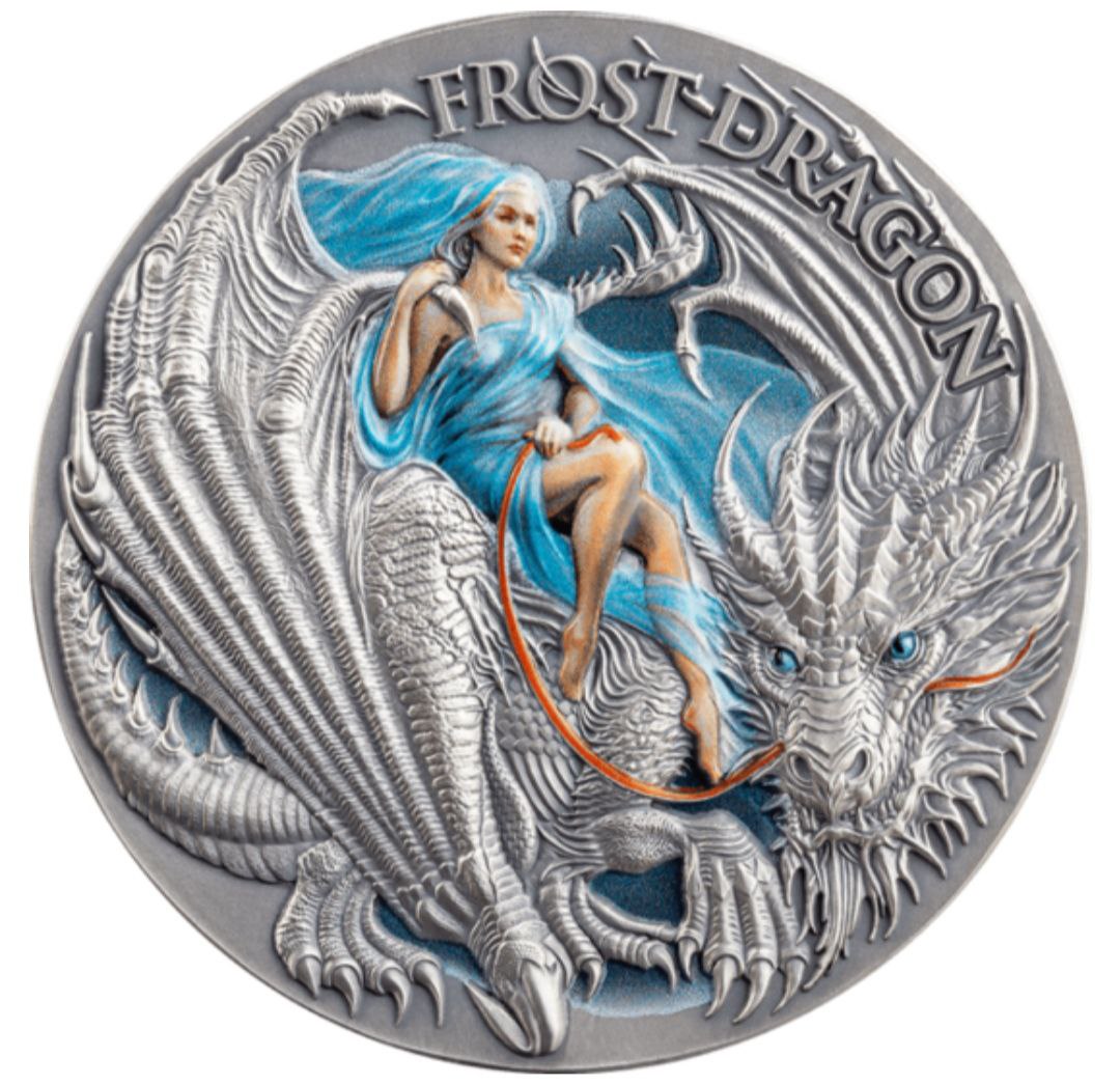 Реверс демонструє захопливу сцену — прекрасна жінка в блакитній накидці сидить на спині величного крижаного дракона. Її образ символізує гармонію людини з природними силами, а сам дракон — потужність і захист. Високий рельєф і вибіркова кольорова обробка підкреслюють контраст між холодним сріблом і яскравими відтінками блакитного та червоного. У верхній частині монети розміщено напис «FROST DRAGON».