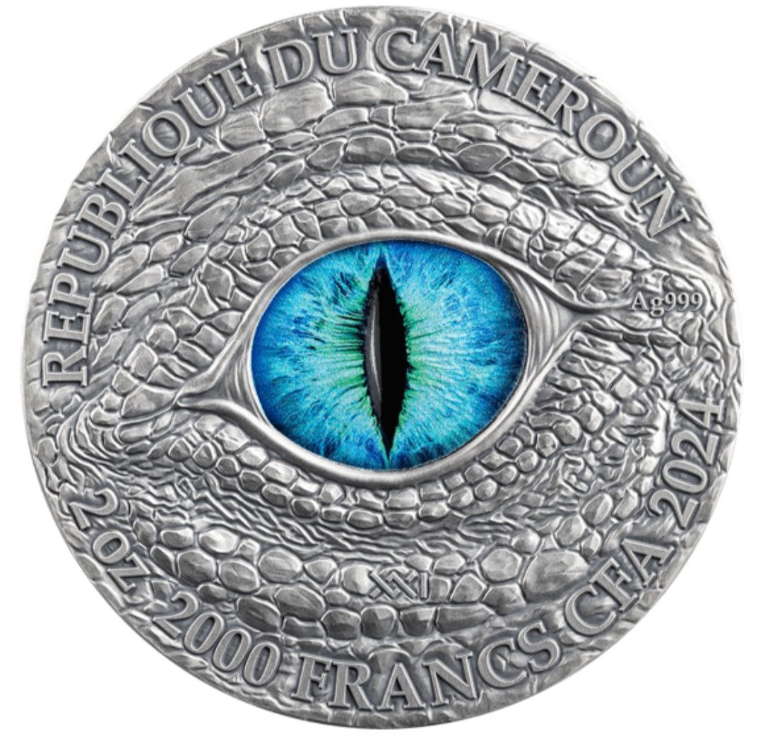 На аверсі монети представлено гіпнотичне око дракона з глибоким блакитним і бірюзовим відтінком. Воно створює ефект живого погляду завдяки детальній гравіровці та кольоровому нанесенню. Луската фактура поверхні підкреслює реалістичність зображення. Навколо розміщені написи «REPUBLIQUE DU CAMEROUN», «2oz 2000 FRANCS CFA», «2024» і «Ag999», що вказують на емітента, номінал, рік випуску та пробу срібла.