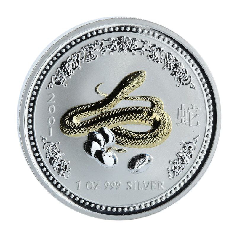 Реверс монети прикрашає зображення витонченої змії, виконане з надзвичайною увагою до деталей. Її тіло вкрите позолотою, що додає контрасту на тлі срібної поверхні. Поруч зображено яйця зі змієнятами. Ліворуч розміщено рік випуску «2001», праворуч — китайський ієрогліф «蛇» (змія), а внизу — напис «1 OZ 999 SILVER» і знак монетного двору «P». Декоративний орнамент уздовж краю надає монеті витонченості й завершеності композиції.