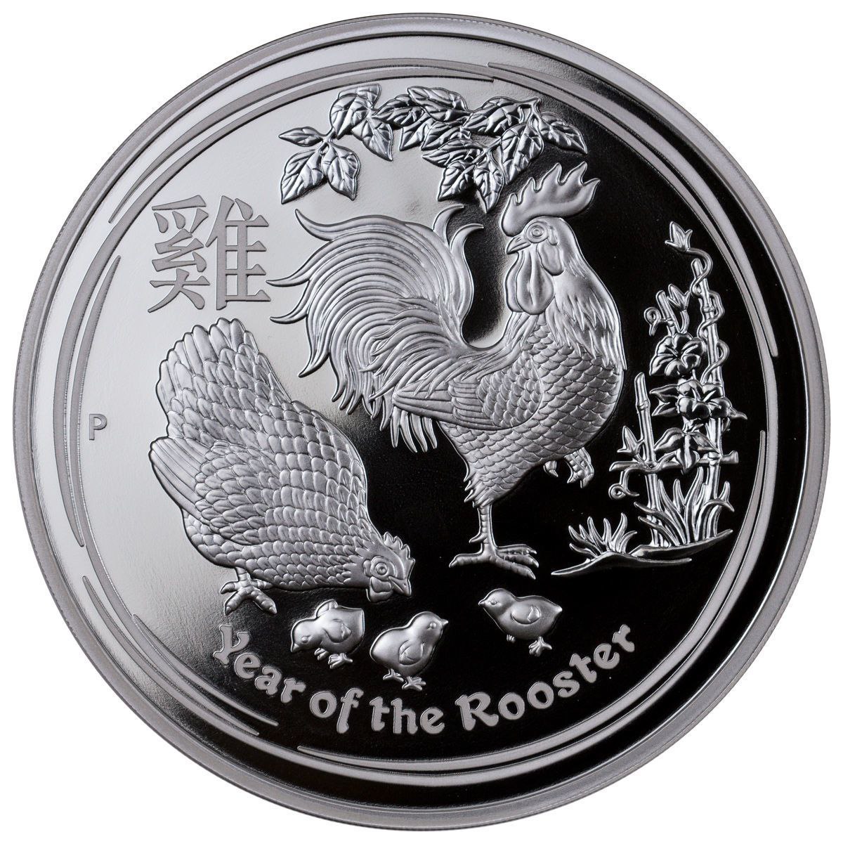 Срібні монети серії «Рік Півня» з колекції Lunar II присвячені символу китайського зодіаку, що уособлює працелюбність, впевненість і відданість своїм принципам. На монетах зображено півня поруч із куркою та курчатами — композицію, яка символізує сімейні цінності, турботу і гармонію в домі. Вишуканий рельєф із детальним опрацюванням пера та природного оточення підкреслює високу майстерність художників Пертського монетного двору. Монети виготовлені зі срібла найвищої проби 999, а окремі варіанти оздоблені кольоровим друком або позолотою, що додає їм виразності та колекційної цінності.