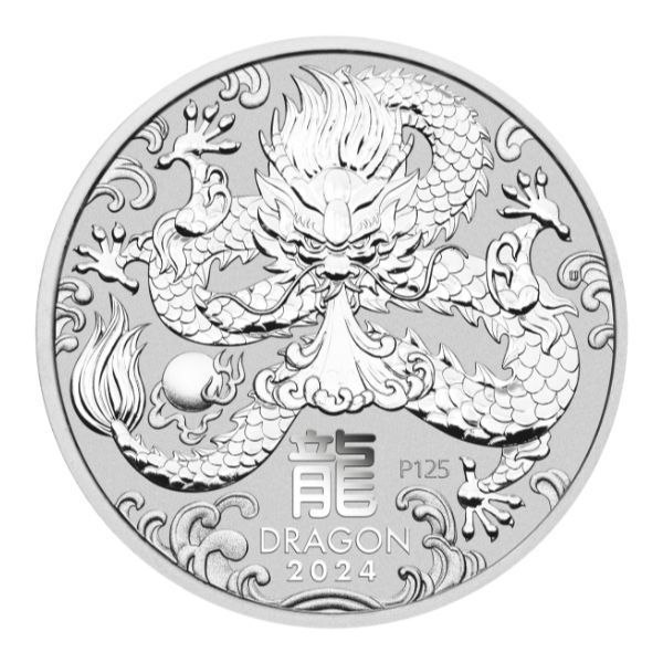 Реверс монети вражає динамічним образом величного дракона, який ширяє серед хмар, тримаючи в лапах перлину мудрості. Його тіло прикрашене детальним лускатим орнаментом, що блищить у променях світла, створюючи відчуття руху. У нижній частині розміщені китайський ієрогліф «龍» (дракон), напис «DRAGON 2024» і знак монетного двору «P125». Художник передав у цьому дизайні силу та благородство, властиві цьому легендарному створінню.