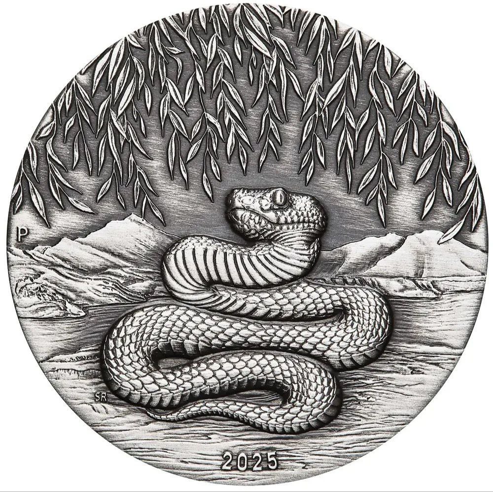 Реверс монети демонструє детально пророблене зображення змії, що згорнулася під гілками верби біля спокійної водної поверхні. Витончене тиснення передає кожну лусочку, створюючи реалістичну текстуру. На задньому плані видно гори, що символізують силу й стабільність, а гілки верби додають гармонії композиції. Внизу розміщено рік випуску «2025», а ліворуч — знак монетного двору «P».