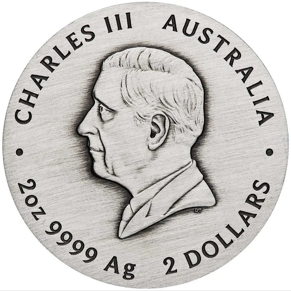 На аверсі монети зображено портрет Його Величності Короля Чарльза III. Навколо портрета розташовані написи «CHARLES III», «AUSTRALIA», а також позначення металу та номіналу — «2 oz 9999 Ag» і «2 DOLLARS». Античне покриття надає зображенню глибини й підкреслює рельєфні лінії, зберігаючи водночас офіційний характер державного платіжного засобу.
