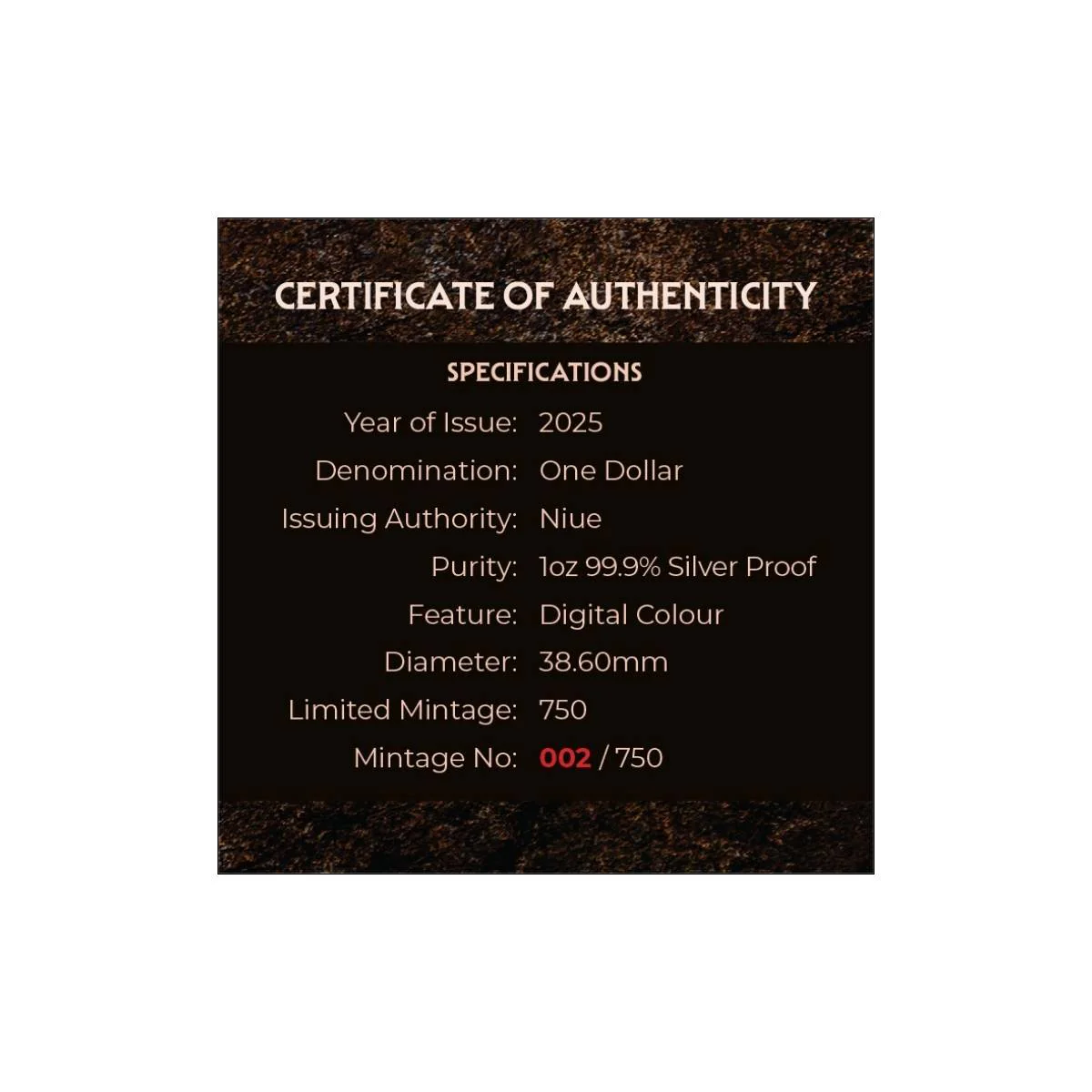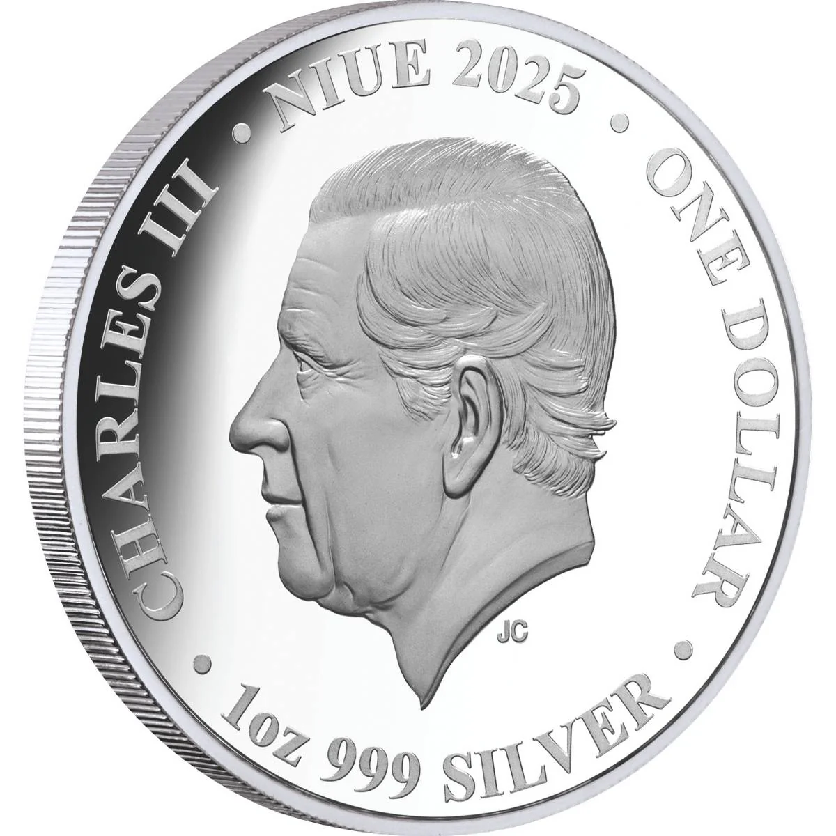 На аверсі монети зображено портрет короля Чарльза III, виконаний із високою точністю та оточений написами: «CHARLES III», «NIUE 2025», «ONE DOLLAR», а також позначенням ваги й проби металу — «1 oz 999 SILVER». Цей бік відзначається стриманим класичним стилем, який традиційно використовується на монетах острова Ніуе.