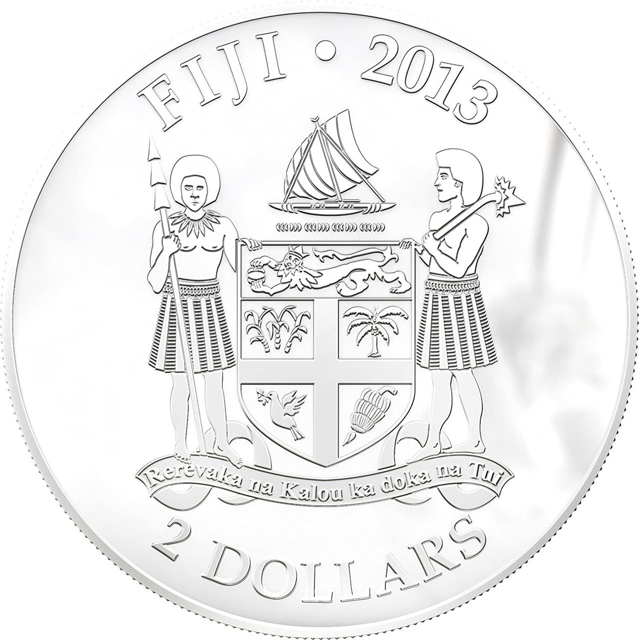 Аверс монети прикрашає державний герб Республіки Фіджі. У центрі розташований щит із чотирма символами — пальмою, голубом, мушлею та цукровою тростиною, що відображають багатство природи та історію країни. Щит підтримують два воїни у традиційному вбранні, а над ним зображено вітрильник — знак морської спадщини. Навколо розміщено написи «FIJI • 2013» і «2 DOLLARS».