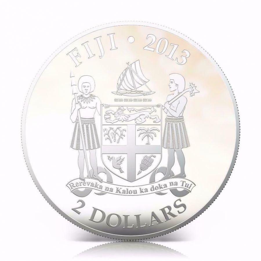 На реверсі монети зображено герб Фіджі, що складається зі щита з національними символами, двох воїнів-стражів по боках і традиційного човна над щитом. У верхній частині розташований напис “FIJI 2013”, який указує країну-емітента та рік випуску, а внизу — номінал “2 DOLLARS”.