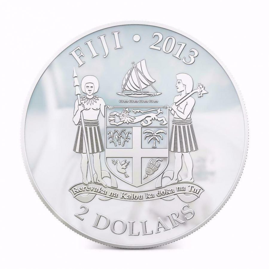 На реверсі показано герб Фіджі, який включає щит із національними символами, двох воїнів-стражів та традиційне судно у верхній частині композиції. Унизу розташований девіз держави та номінал “2 DOLLARS”, а зверху — напис “FIJI 2013”, що вказує на країну-емітента та рік випуску монети.