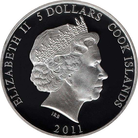 На аверсі зображено портрет Її Величності королеви Єлизавети II у профіль. По колу розміщено написи: «ELIZABETH II», «COOK ISLANDS», «5 DOLLARS» та рік випуску «2011». Дзеркальне тло підкреслює кожну деталь портрета, надаючи монеті елегантного вигляду та високої якості виконання.