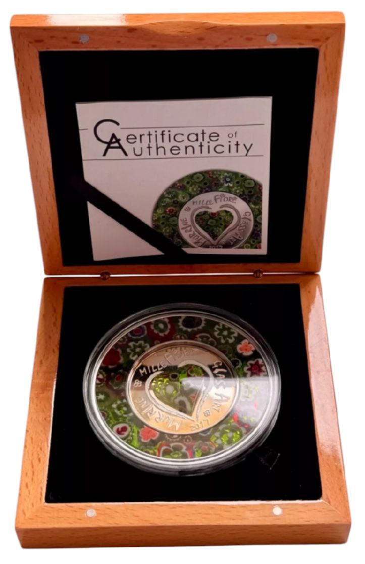 На аверсі монети зображене серце, створене із кольорового скла Мурано, що виблискує яскравими зеленими, білими, червоними та помаранчевими відтінками. Орнамент нагадує розсип квітів, кожна з яких має унікальний малюнок. Навколо серця викарбувані написи «MILLEFIORI GLASS ART» і «MURRINE», а також рік випуску «2017». Такий дизайн створює ефект об’ємності, ніби квіти розквітають просто на поверхні монети.