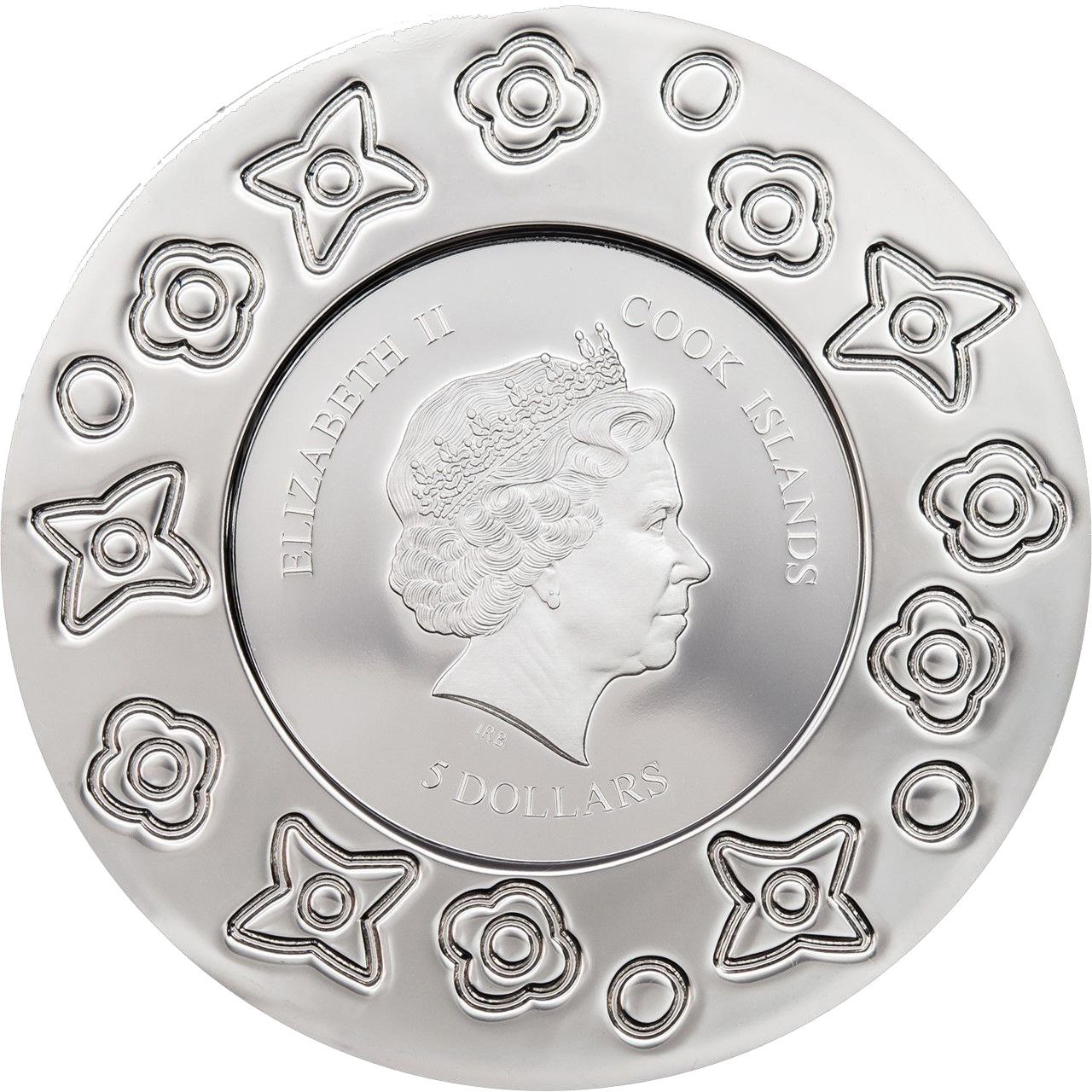 Реверс прикрашений портретом Її Величності Королеви Єлизавети II, оточеним написами «ELIZABETH II», «COOK ISLANDS» і «5 DOLLARS». Уздовж краю монети розташовано витончене рельєфне кільце з квітковим орнаментом, що перегукується зі стилем муранського скла, підкреслюючи загальну художню концепцію.