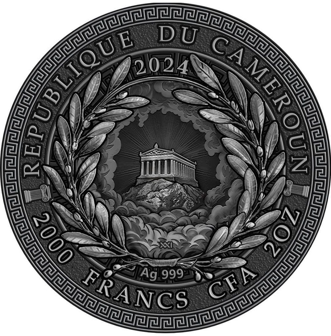 Аверс монети прикрашає зображення античного храму, освітленого променями, що символізують божественне світло слави. Композицію обрамляє лавровий вінок — традиційний знак перемоги. Навколо розміщені написи «REPUBLIQUE DU CAMEROUN», «2024», «2000 FRANCS CFA», «2 OZ» та «Ag 999», які вказують на країну-емітента, рік випуску, номінал, вагу та пробу срібла.
