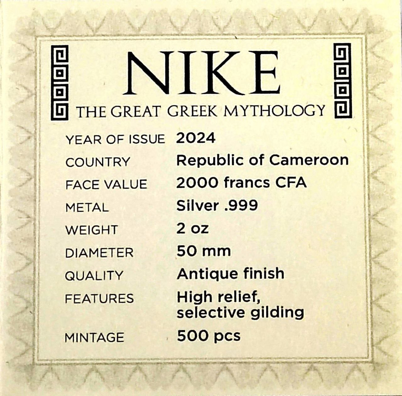 Срібна монета «Nike» 2024 року — це величний витвір, присвячений богині перемоги у давньогрецькій міфології. Вона уособлює тріумф, мужність і славу, які надихали воїнів на подвиги та героїчні звершення. Випущена Республікою Камерун, ця монета поєднує античну символіку з сучасною нумізматичною майстерністю, створюючи справжній шедевр, що вражає глибиною рельєфу й деталізацією.