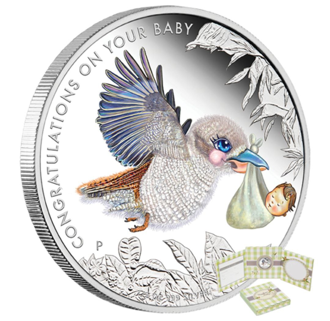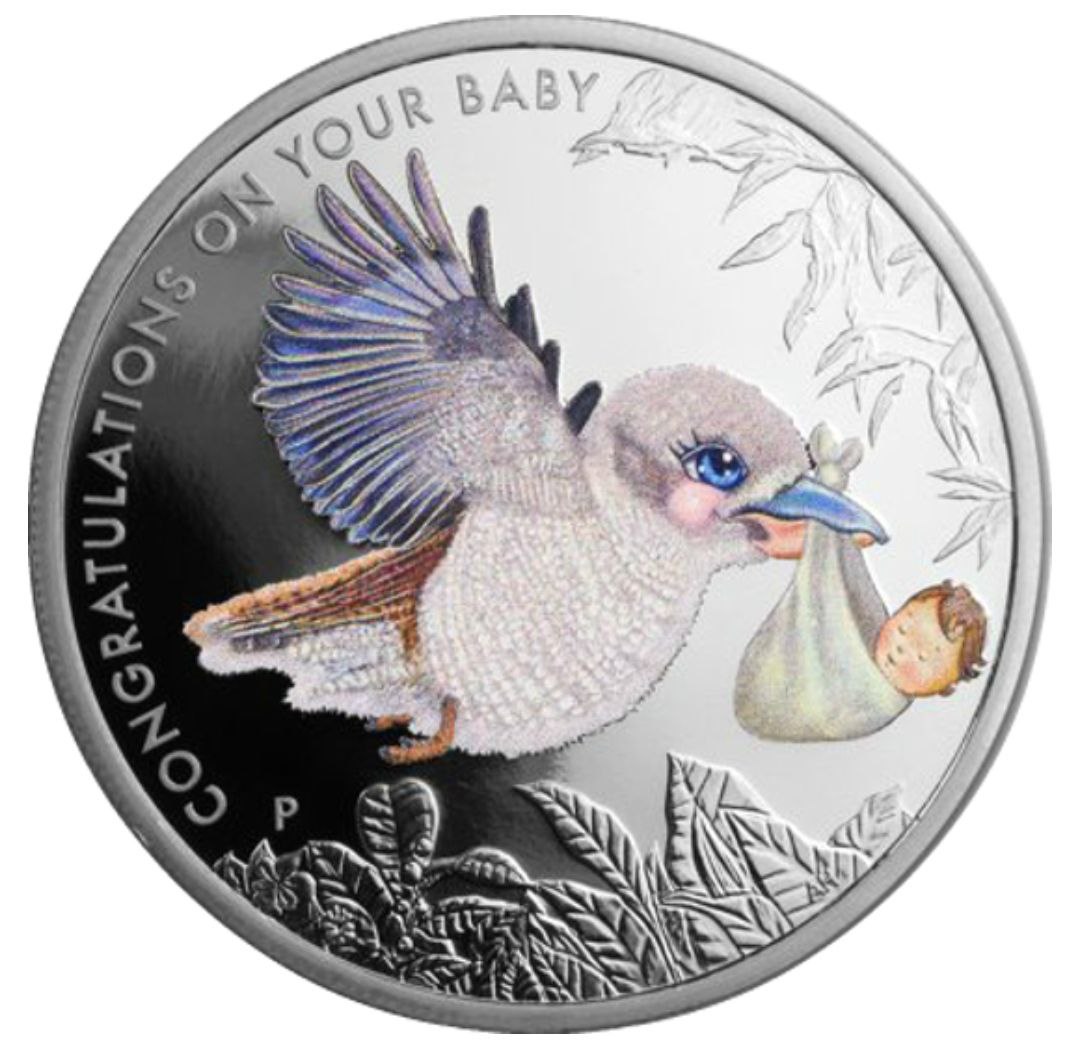 На аверсі монети представлено кольорове зображення кукабури, яка тримає у дзьобі мішечок із немовлям — популярний символ появи дитини на світ. Птах виконаний із ніжними відтінками та дрібною деталізацією пір’я, що створює м’який і теплий настрій. У верхній частині аверсу розміщено напис “CONGRATULATIONS ON YOUR BABY”, а внизу — знак монетного двору Perth Mint та декоративні рослинні елементи.
