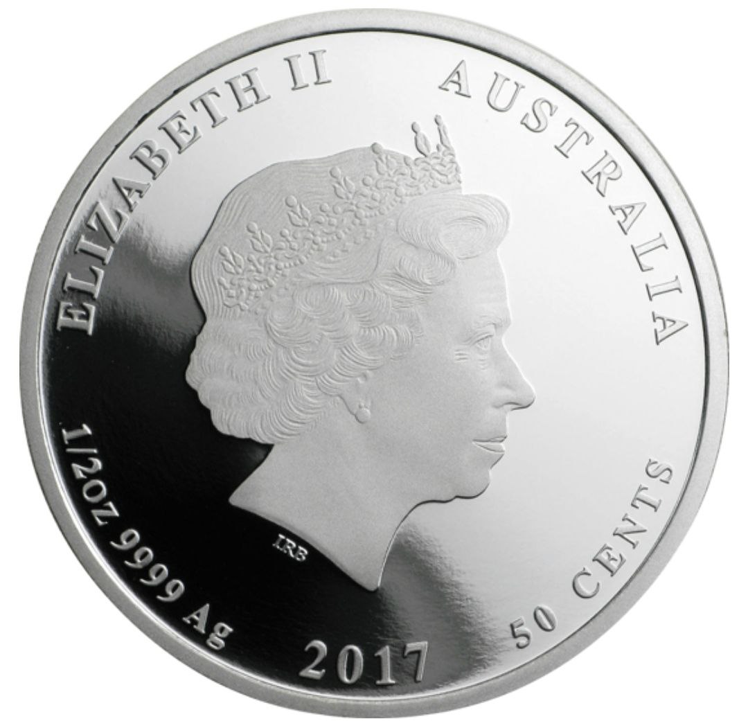 На реверсі монети зображено портрет королеви Єлизавети II у профіль, оточений написами “ELIZABETH II” та “AUSTRALIA”, які позначають країну-емітента. Унизу вказано номінал “50 CENTS” і рік випуску 2017. Додатково зазначена вага та проба срібла — “1/2 OZ 9999 Ag”. Дизайн реверсу виконаний у строгому класичному стилі, характерному для австралійських інвестиційних та колекційних монет.