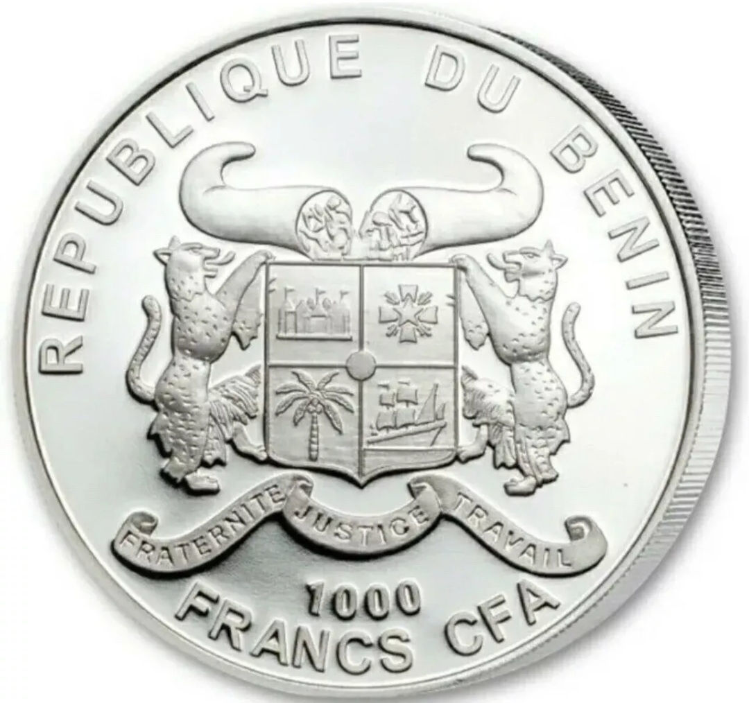 Реверс монети містить герб Республіки Бенін із зображенням щита, двох леопардів і девізом «FRATERNITE – JUSTICE – TRAVAIL». У нижній частині вказано номінал — 1000 Francs CFA, а також назву країни-емітента «REPUBLIQUE DU BENIN».