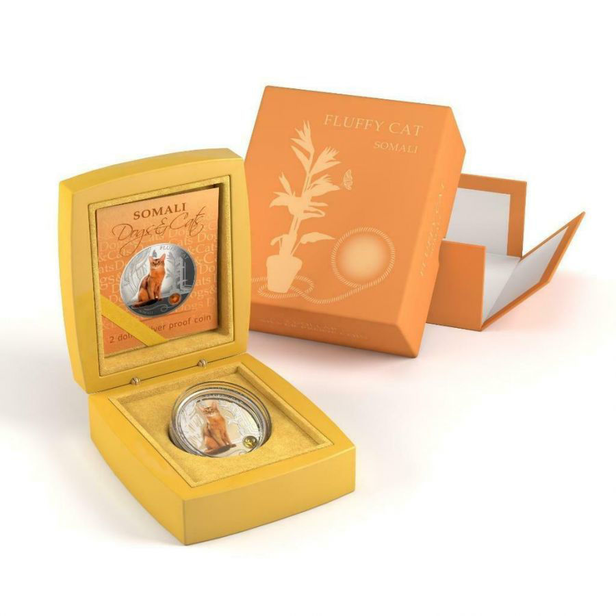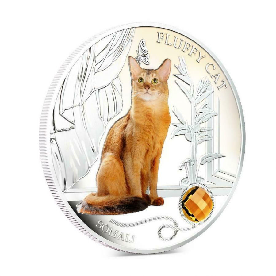 Срібна монета «Пухнастий кіт — Сомалійський» (Fluffy Cat – Somali) випущена у 2013 році від імені держави Фіджі. Вона належить до колекційної серії, присвяченої домашнім улюбленцям, і присвячена одній із найелегантніших порід котів — сомалійському. Ця монета вражає ніжністю композиції та гармонійним поєднанням кольору, блиску срібла й кристалічної вставки.