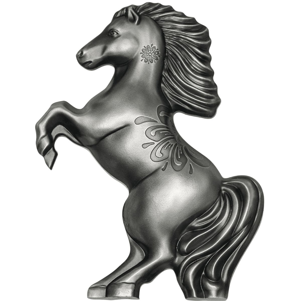 Реверс монети виконаний у формі стрибаючого коня з високо піднятою гривою — символу волі й могутності. На тілі коня розташовано декоративний орнамент у східному стилі, що підсилює художню естетику. Завдяки високому рельєфу та антикварному покриттю монета виглядає як маленька скульптура, поєднуючи монетне мистецтво й ювелірну витонченість.