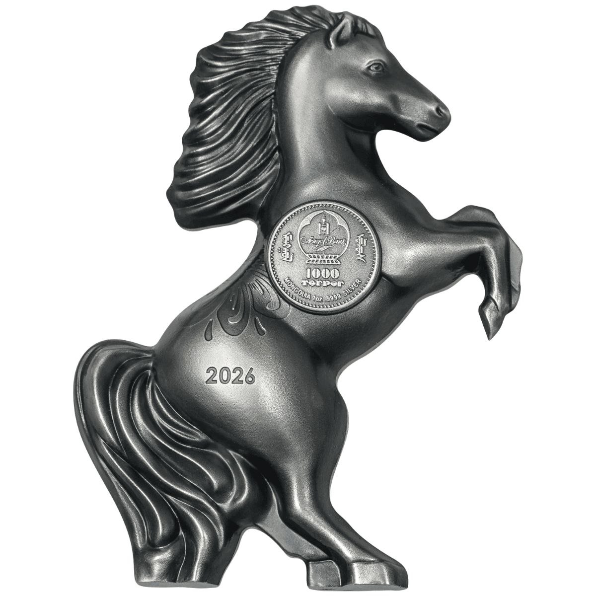 Срібна монета у формі коня «Year of the Horse» 2026 року випущена Монголією в рамках унікальної серії «Lunar Year Collection». Ця монета відрізняється надзвичайним тривимірним дизайном і незвичною формою, що точно відтворює фігуру коня — символа енергії, свободи та сили духу. Її створено на честь року Коня за китайським місячним календарем, який асоціюється з успіхом, наполегливістю і шляхетністю.