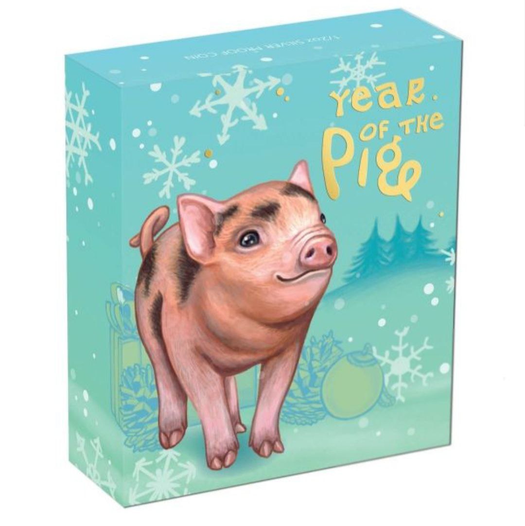 Реверс монети зображує чарівне порося, виконане у кольоровій техніці, що стоїть на тлі традиційних китайських символів процвітання — квітів та декоративних предметів. Праворуч розміщено ієрогліф «猪» (Свиня), під яким написано «YEAR OF THE PIG». Композиція створює атмосферу тепла, радості та добробуту, що характерна для цього знаку.