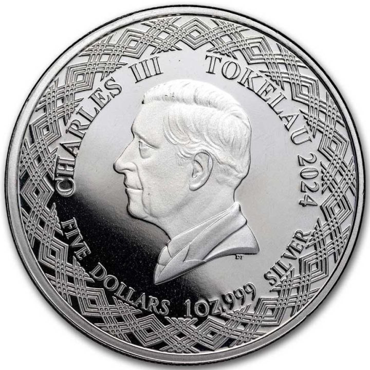На аверсі монети представлено портрет Його Величності Короля Чарльза III, який оточений геометричним візерунком у формі переплетених ліній, що символізують єдність традицій і безперервність часу. Навколо розташовані написи «CHARLES III», «TOKELAU 2024», «FIVE DOLLARS 1 OZ .999 SILVER», що вказують на країну-емітента, рік випуску, номінал та чистоту металу. Дзеркальне тло та рельєфні деталі підкреслюють високу якість виконання.