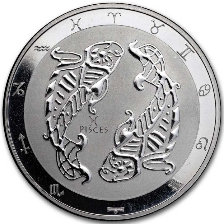 Реверс монети присвячено знаку Риб — символу емоційної чутливості, інтуїції та творчої енергії. У центрі зображено дві стилізовані риби, що рухаються у протилежних напрямках, утворюючи гармонійну композицію. Їх візерункове оформлення поєднує плавні лінії та орнаментальні елементи, створюючи відчуття руху й водної течії. Надпис «PISCES» і знак ♓ розміщені в центрі, а навколо проходить кільце із символами інших знаків зодіаку, що підкреслює належність монети до астрологічної серії.