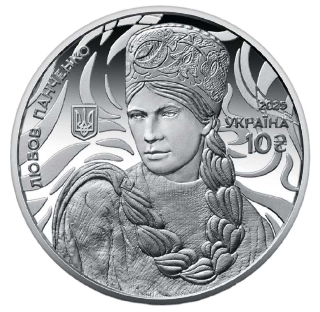На аверсі монети зображено стилізований портрет Любові Панченко, обрамлений елементами її славнозвісного твору “Бучанська весна”. Її погляд, сповнений творчої енергії та свободи, проникає крізь час і простір, символізуючи силу та відданість своїм ідеалам. Ліворуч від портрету розташований малий Державний Герб України, надпис “ЛЮБОВ ПАНЧЕНКО” праворуч – рік карбування 2025, надпис “УКРАЇНА”, номінал 10 та графічний символ гривні. Ця композиція підкреслює тісний зв’язок художниці з її батьківщиною.