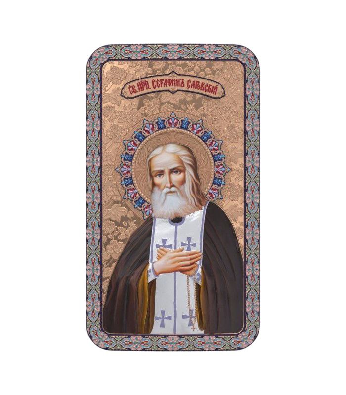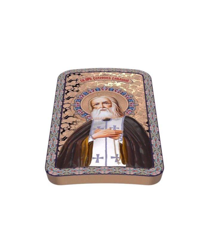 Аверс монети прикрашений кольоровим образом преподобного Серафима Саровського, який зображений у традиційних монаших ризах із натхненним, спокійним обличчям. Його руки складені на грудях у жесті молитви, що символізує мир, смирення та любов до ближнього. Навколо голови святого сяє німб, оздоблений візерунком із блакитних і золотих елементів. Тло монети виконане у вишуканому орнаментальному стилі з квітковими мотивами, що нагадують позолочені іконостаси стародавніх храмів.