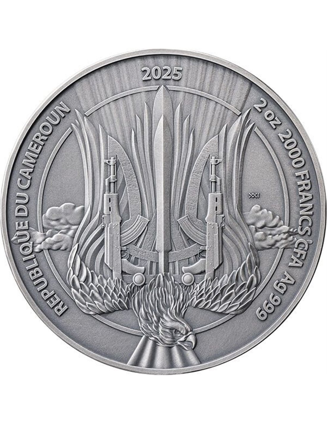 На аверсі зображено складний малюнок українського герба із зображенням гвинтівок, ракет та орла в польоті внизу, що символізує силу та єдність. Навколо центрального малюнка розміщено надписи: «REPUBLIQUE DU CAMEROUN» – країна-емітент, «2025» – рік випуску, «2 oz 2000 FRANCS CFA» – номінал і вага та «Ag 999» – проба срібла .