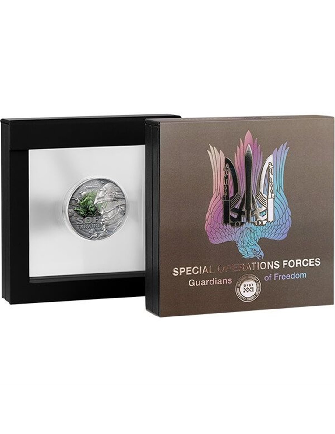 Ця вишукана срібна монета вагою 2 унції є частиною серії «Вартові свободи» та символізує мужність елітних воїнів, які беруть на себе найнебезпечніші місії для захисту національної безпеки. Ця монета має приголомшливий рельєф й античну обробку. Вона поставляється в футлярі разом із сертифікатом автентичності. Обмежений тираж, лише 1000 штук по всьому світу!