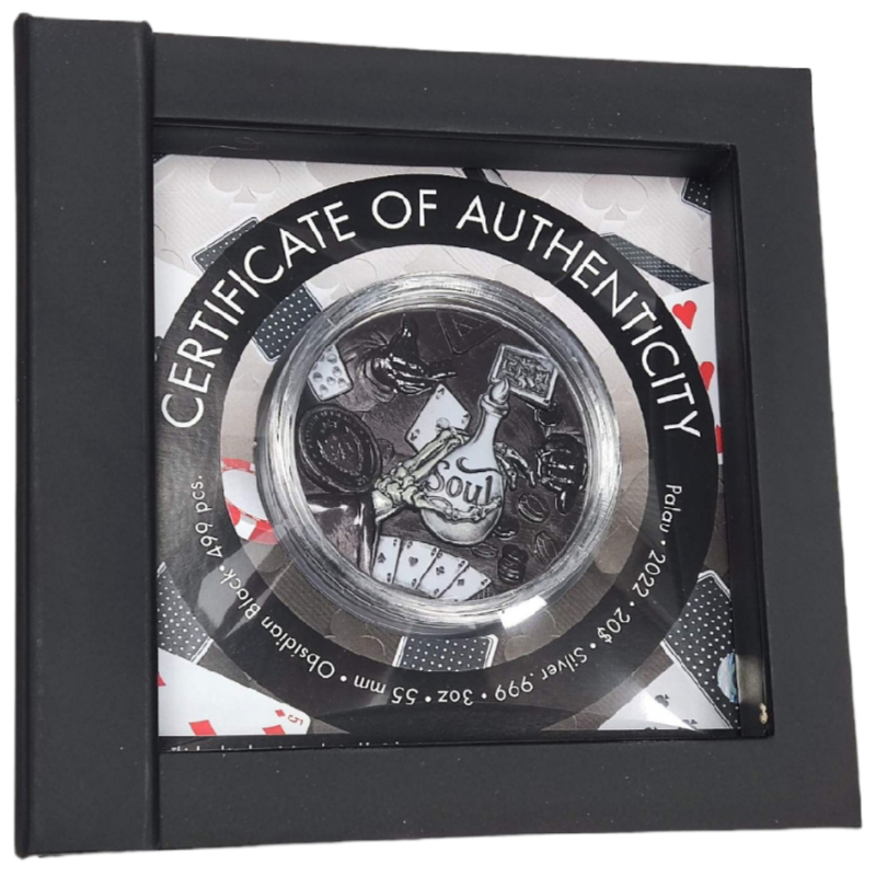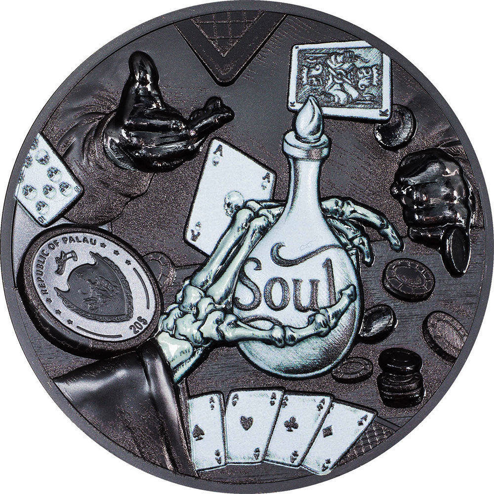 На аверсі монети зображено скелетонічну руку, яка тримає пляшку з написом «Soul», навколо якої розсипані карти, кості, фішки та монети. На одній із монет присутній герб Республіки Палау, номінал «20$» та рік випуску. Ця сцена передає атмосферу азарту, де навіть душа стає частиною гри.