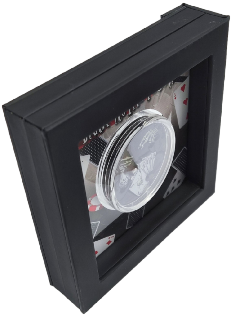 Срібна монета «Темний флеш-рояль» 2022 року – це унікальний колекційний витвір мистецтва, присвячений темі азарту, ризику та філософії гри зі смертю. Вона символізує боротьбу між життям і спокусами, де навіть душа може стати ставкою заради перемоги. Дизайн монети виконано в контрастних чорних і білих тонах із високим рельєфом, що створює ефект глибини та містичності.