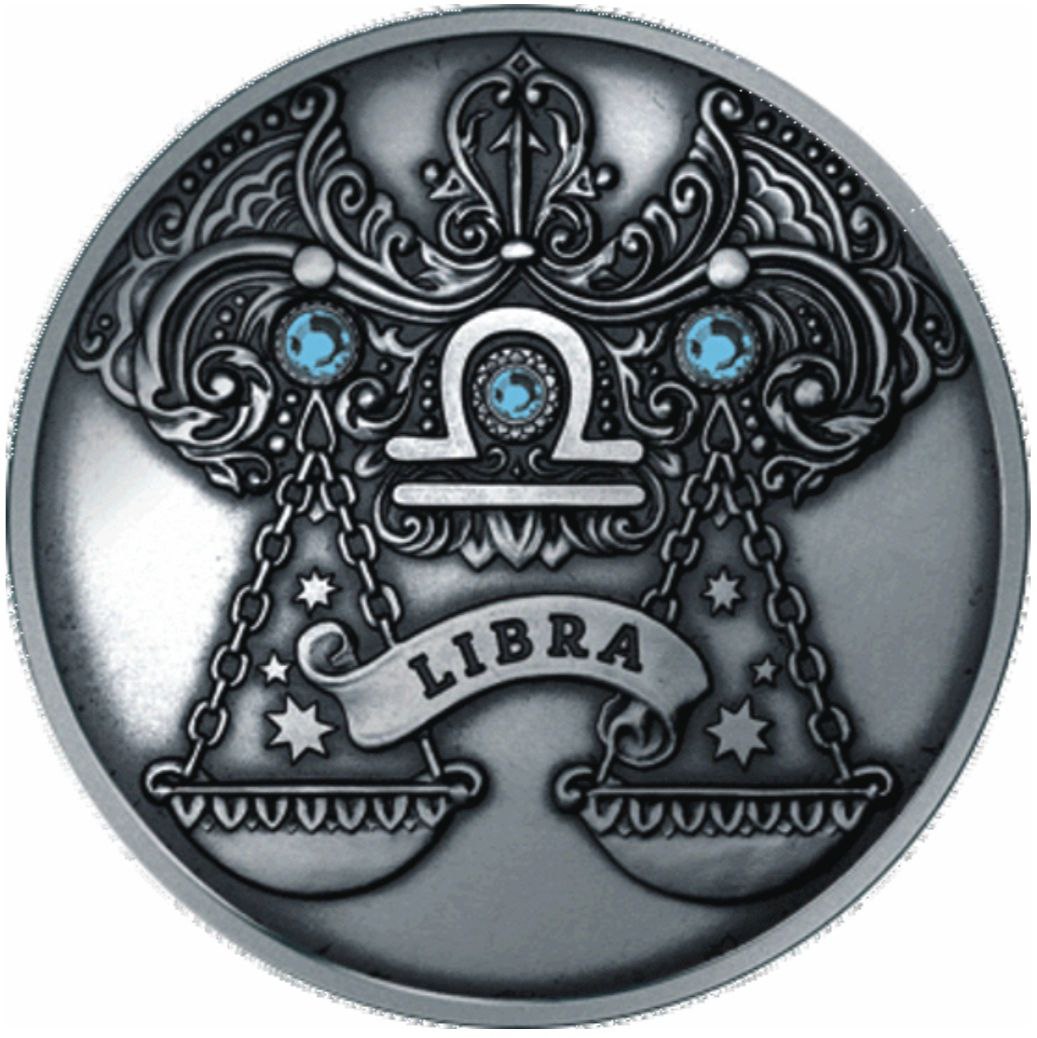 Реверс монети присвячений знаку Терезів — у центрі розташовано зображення ваг, що символізують баланс і справедливість. Над символом викарбувано стрічку з написом «LIBRA». Композицію прикрашають три блакитні кристали, що уособлюють ясність думок, спокій і гармонію. Орнамент із завитками навколо символу створює відчуття легкості та рівноваги — головних якостей цього знаку.