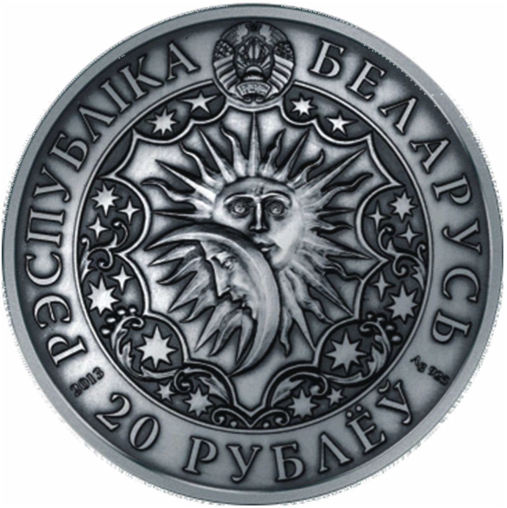 Аверс монети прикрашений гербом Республіки Білорусь, у центрі якого зображені Сонце та Місяць — символи єдності протилежностей і космічного порядку. Навколо розташовані декоративні зоряні орнаменти, що додають композиції гармонійності. По колу викарбувано написи «РЭСПУБЛІКА БЕЛАРУСЬ», «20 РУБЛЁЎ», пробу срібла «Ag 925» та рік випуску «2013».