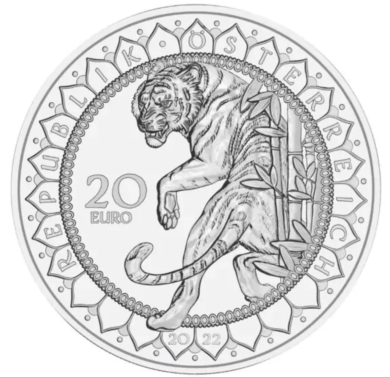 Аверс монети прикрашений витонченим зображенням тигра серед бамбукових пагонів. Тварина виглядає напруженою та водночас спокійною, передаючи природну грацію і силу цього хижака. У центрі вказано номінал «20 EURO» і рік випуску «2022». По колу розміщено напис «REPUBLIK ÖSTERREICH», що вказує на емітента — Республіку Австрія. Деталізація шерсті та рослинності створює ефект об’єму, підкреслюючи майстерність граверів.