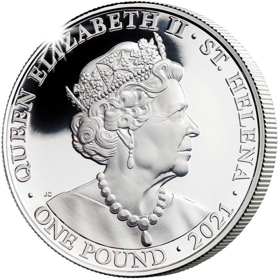 Аверс монети містить класичний портрет королеви Єлизавети II у профіль, виконаний у традиційному стилі. Навколо зображення розміщені надписи “QUEEN ELIZABETH II”, “ST. HELENA”, “ONE POUND” та рік випуску “2021”. Дизайн аверсу зберігає офіційний статус монети та її походження.