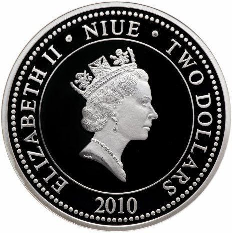 На аверсі монети зображено портрет Її Величності королеви Єлизавети II. Навколо зображення розміщені написи: «ELIZABETH II», «NIUE», «TWO DOLLARS» і рік випуску — «2010». Дзеркальне тло підкреслює чіткість деталей і класичну композицію.