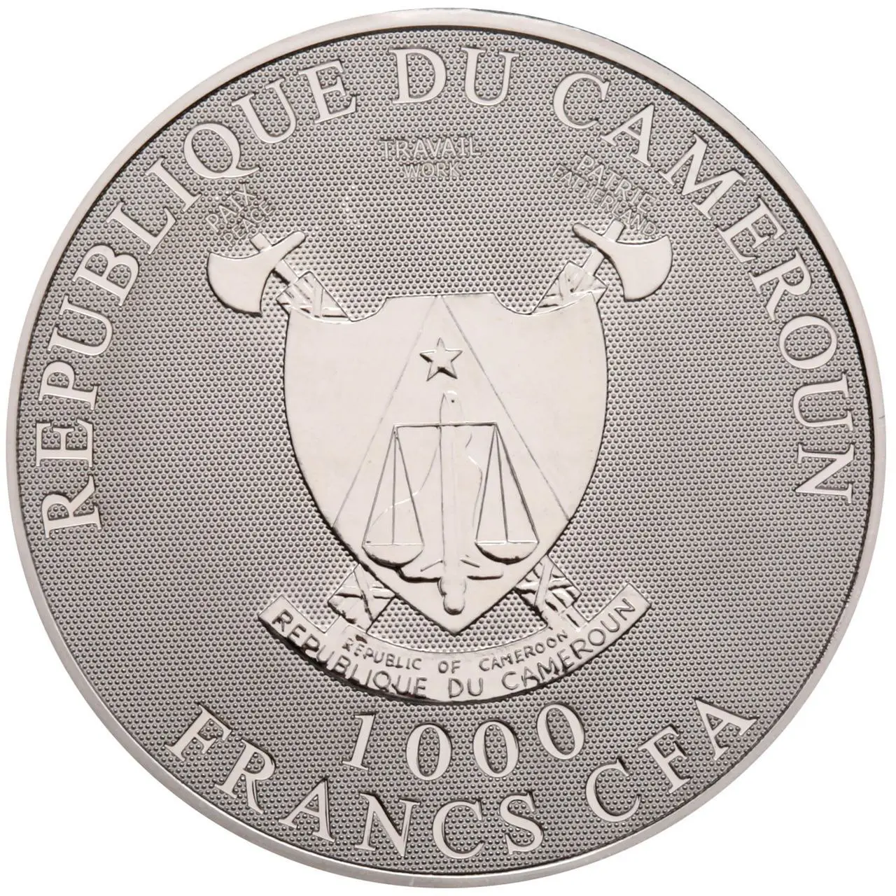 Реверс містить герб Республіки Камерун із девізом «PAIX – TRAVAIL – PATRIE» («Мир – Праця – Батьківщина»). Навколо герба розташовано напис «REPUBLIQUE DU CAMEROUN» і номінал «1000 FRANCS CFA». Візерунок тла повторює текстуру аверсу, забезпечуючи гармонійність загального вигляду.