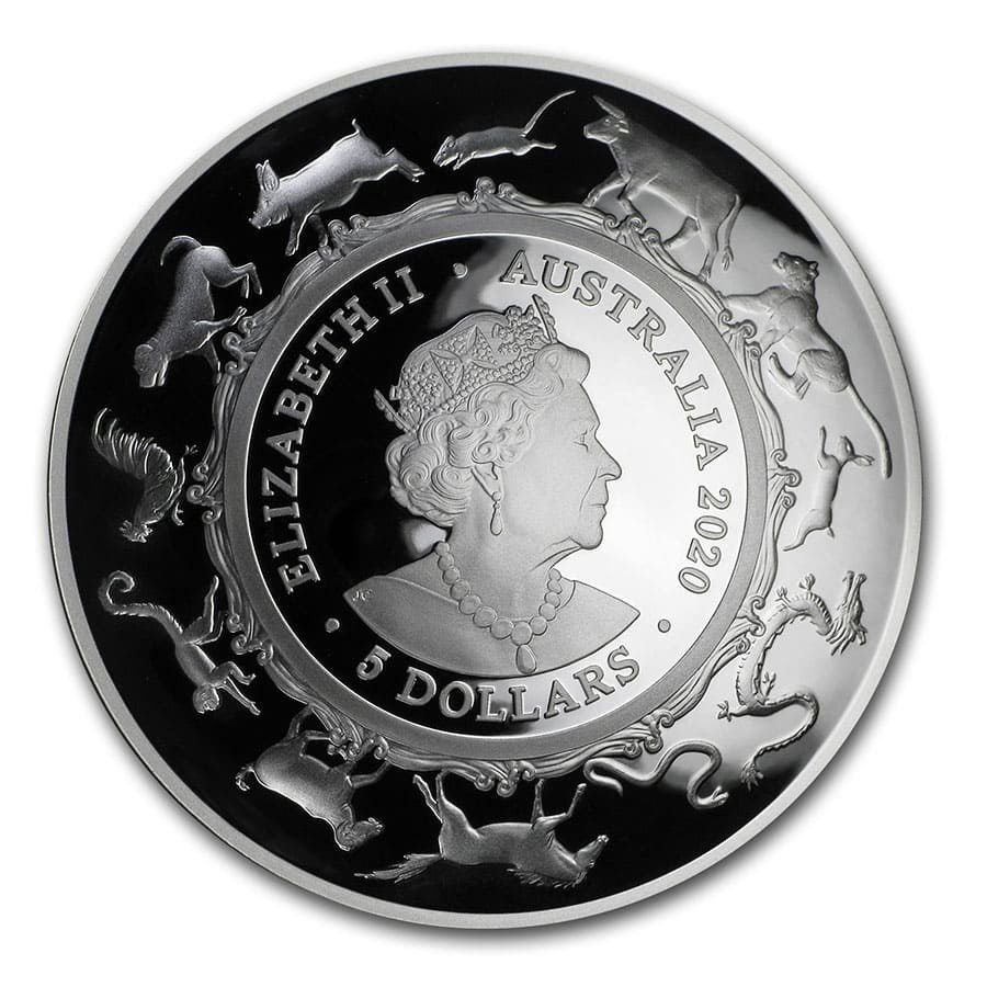 На аверсі монети зображено портрет Її Величності Королеви Єлизавети II. Навколо профілю розміщено написи «ELIZABETH II», «AUSTRALIA», «2020» і «5 DOLLARS». Відмінною рисою цієї серії є обрамлення портрета дванадцятьма фігурами тварин китайського зодіаку, що утворюють символічне коло, нагадуючи про циклічність часу та гармонію Всесвіту.