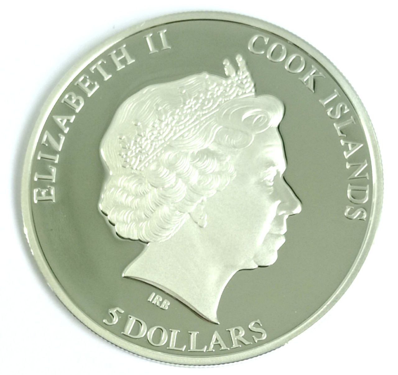 На аверсі зображено портрет Її Величності королеви Єлизавети II. По колу розміщені написи «ELIZABETH II», «COOK ISLANDS» і «5 DOLLARS», що вказують на країну-емітента, номінал та офіційний статус монети як законного платіжного засобу. Дзеркальне поле аверсу підкреслює строгість і урочистість композиції.